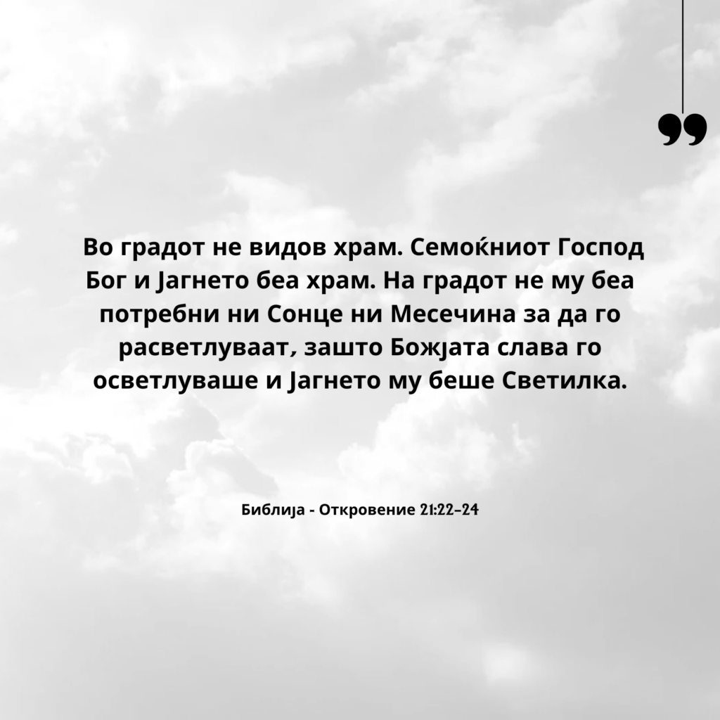 Во градот не видов храм. Семоќниот Господ Бог и Јагнето беа храм. На градот не му беа потребни ни Сонце ни Месечина за да го расветлуваат, зашто Божјата слава го осветлуваше и Јагнето му беше Светилка.