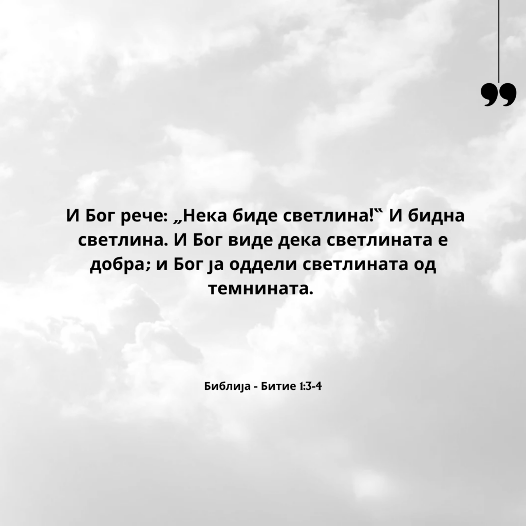 И Бог рече: „Нека биде светлина!“ И бидна светлина. И Бог виде дека светлината е добра; и Бог ја оддели светлината од темнината.