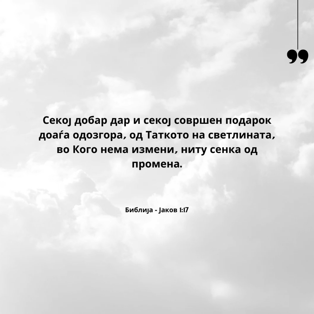 Секој добар дар и секој совршен подарок доаѓа одозгора, од Таткото на светлината, во Кого нема измени, ниту сенка од промена.