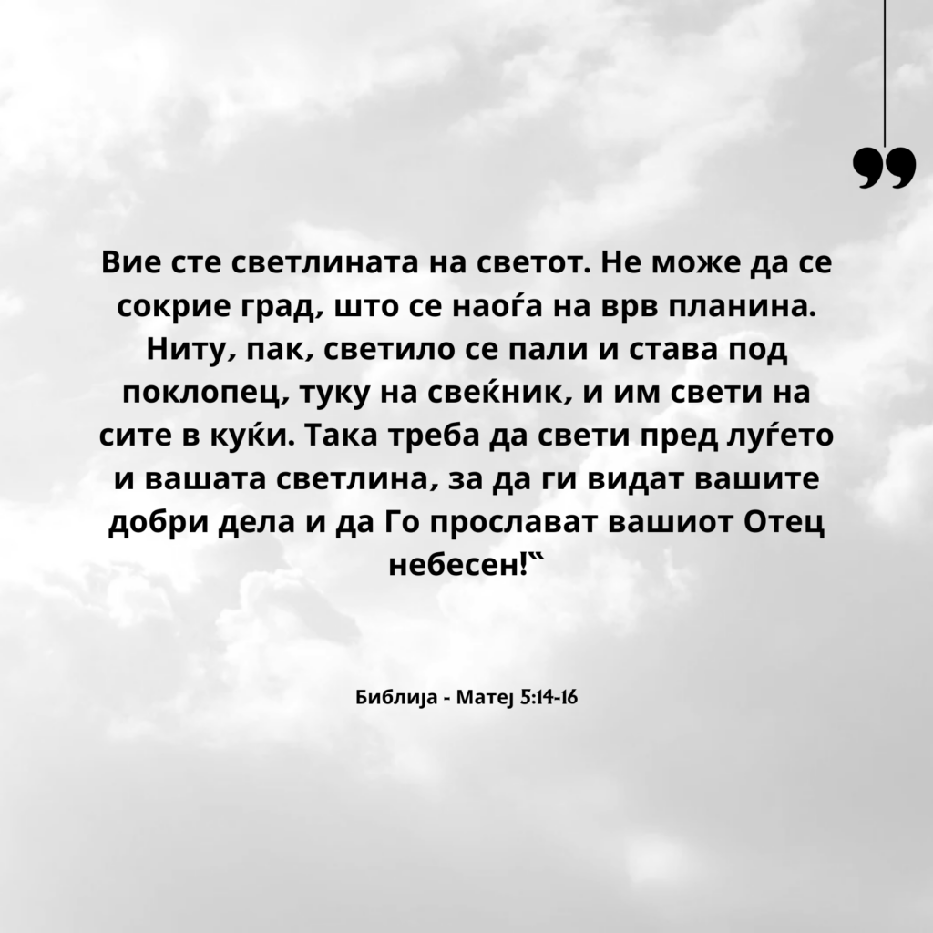 Вие сте светлината на светот. Не може да се сокрие град, што се наоѓа на врв планина. Ниту, пак, светило се пали и става под поклопец, туку на свеќник, и им свети на сите в куќи. Така треба да свети пред луѓето и вашата светлина, за да ги видат вашите добри дела и да Го прослават вашиот Отец небесен!“