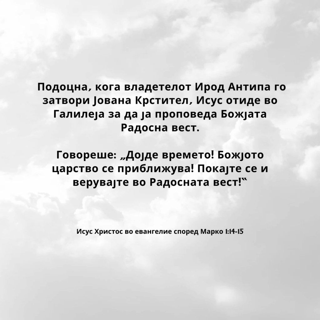 Говореше: „Дојде времето! Божјото царство се приближува! Покајте се и верувајте во Радосната вест!“