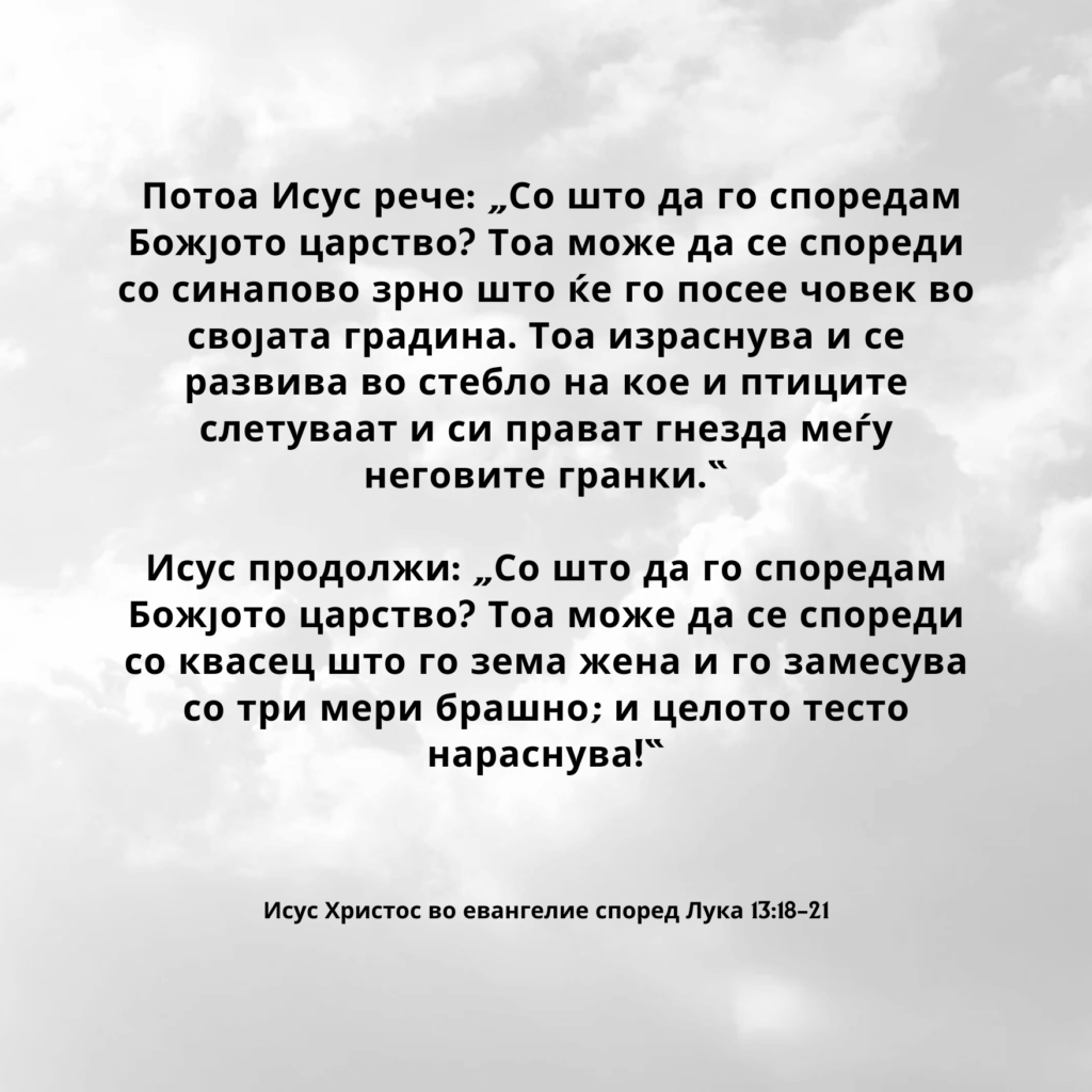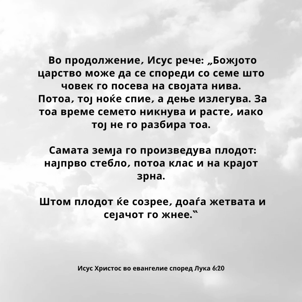 Во продолжение, Исус рече: „Божјото царство може да се спореди со семе што човек го посева на својата нива.