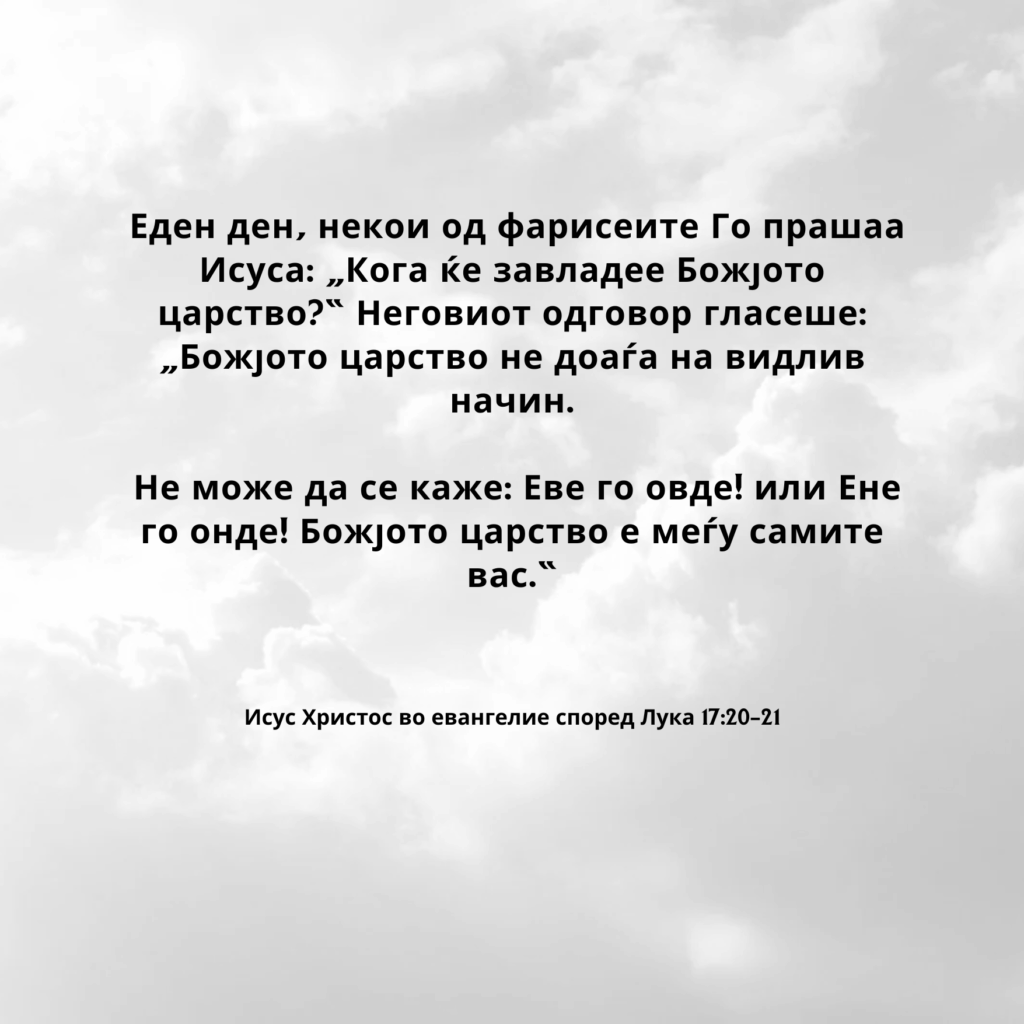 Не може да се каже: Еве го овде! или Ене го онде! Божјото царство е меѓу самите вас.“