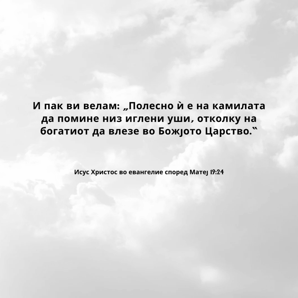 И пак ви велам: „Полесно ѝ е на камилата да помине низ иглени уши, отколку на богатиот да влезе во Божјото Царство.“