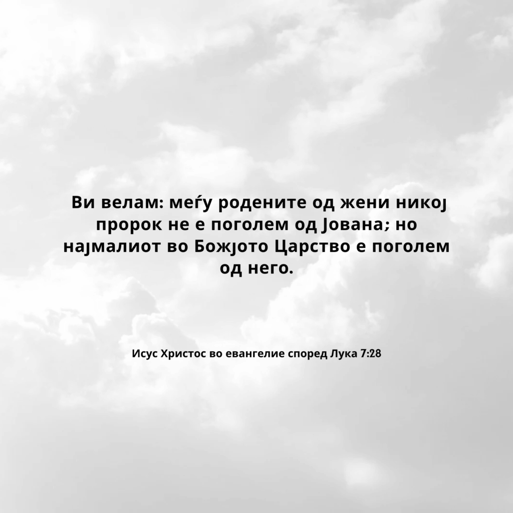 Ви велам: меѓу родените од жени никој пророк не е поголем од Јована; но најмалиот во Божјото Царство е поголем од него.