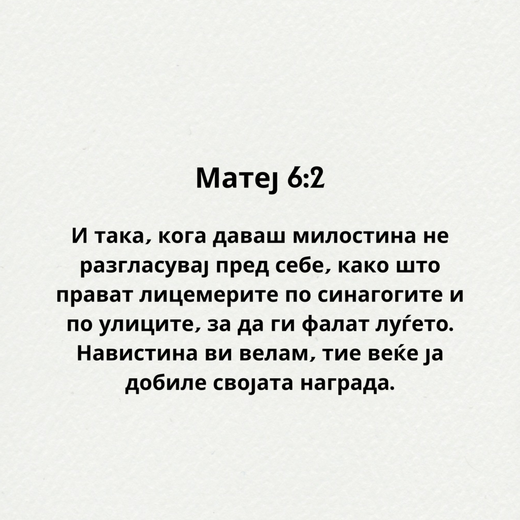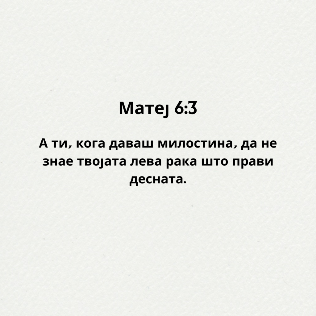 А ти, кога даваш милостина, да не знае твојата лева рака што прави десната. Матеј 6:3