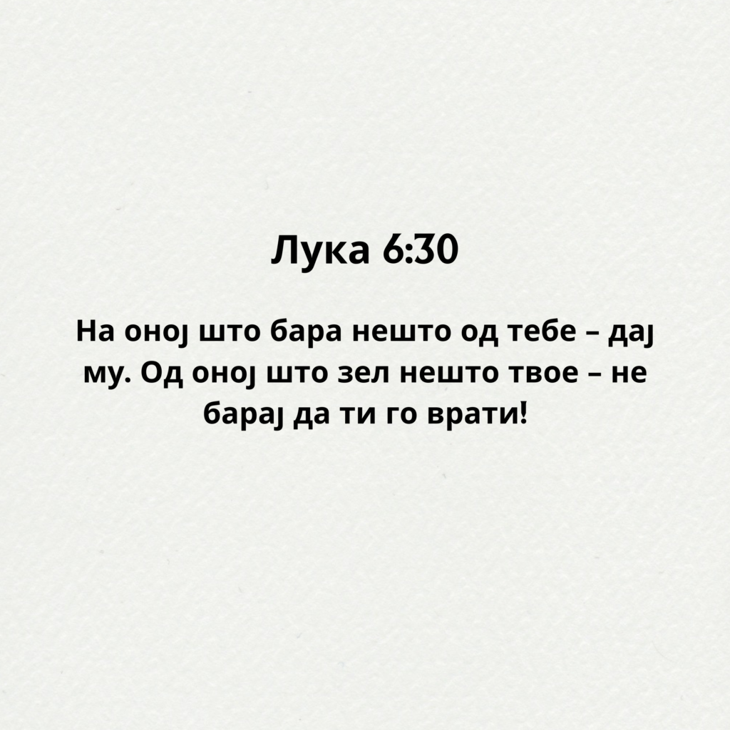 На оној што бара нешто од тебе – дај му. Од оној што зел нешто твое – не барај да ти го врати! Лука 6:30