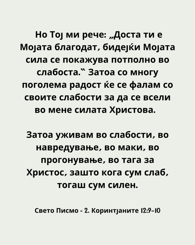 Но Тој ми рече: „Доста ти е Мојата благодат, бидејќи Мојата сила се покажува потполно во слабоста.“ Затоа со многу поголема радост ќе се фалам со своите слабости за да се всели во мене силата Христова.