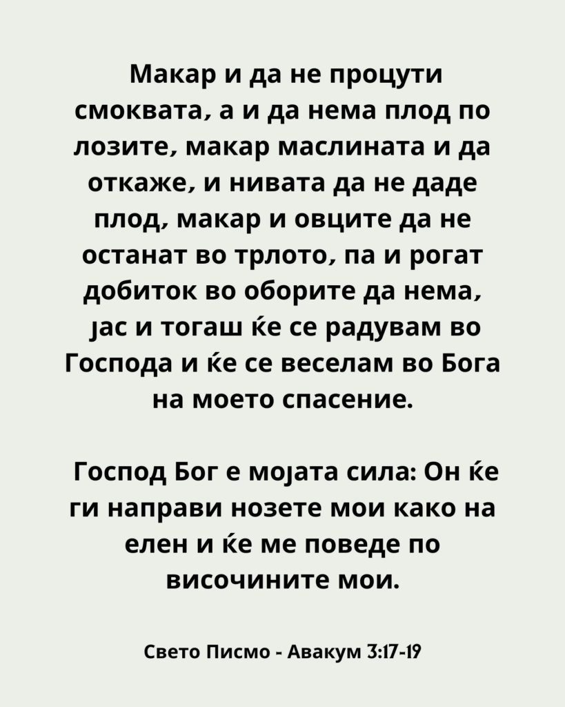 Макар и да не процути смоквата, а и да нема плод по лозите, макар маслината и да откаже, и нивата да не даде плод, макар и овците да не останат во трлото, па и рогат добиток во оборите да нема,