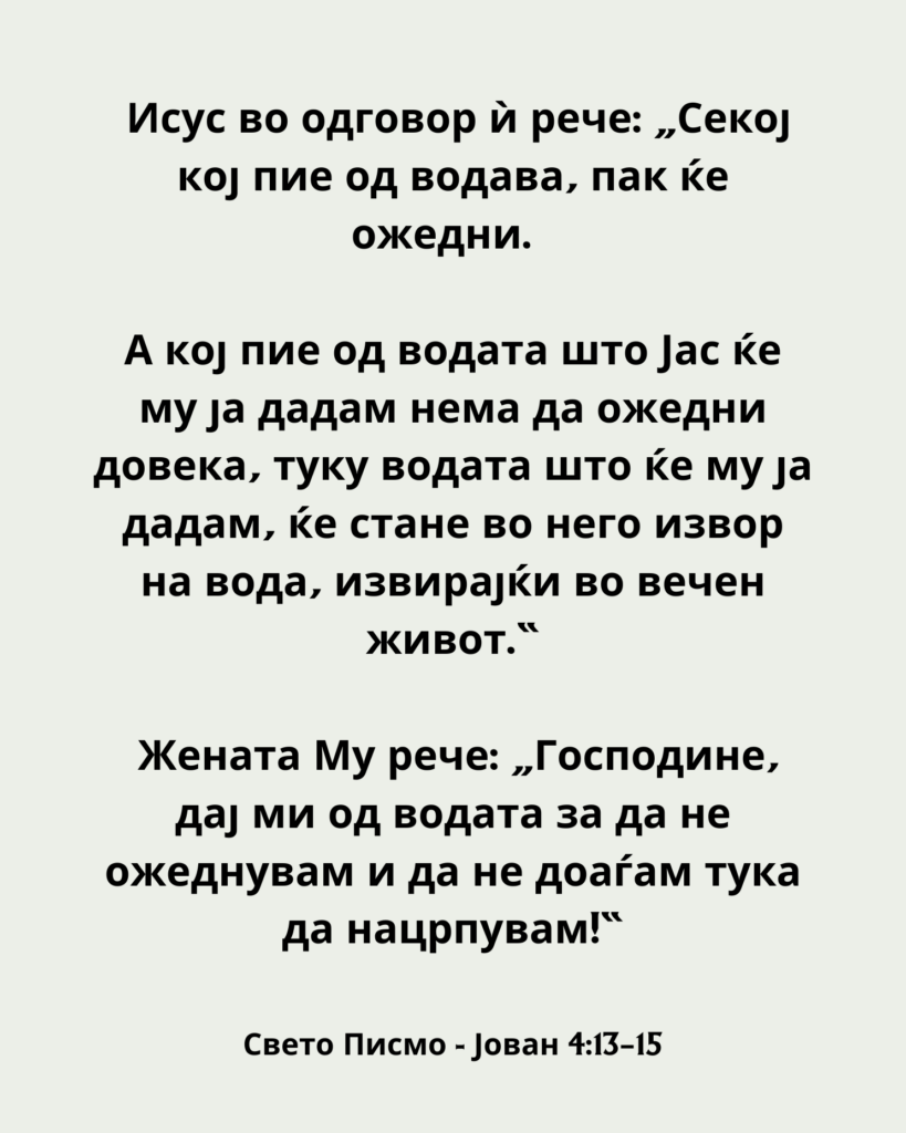 А кој пие од водата што Јас ќе му ја дадам нема да ожедни довека, туку водата што ќе му ја дадам, ќе стане во него извор на вода, извирајќи во вечен живот.“