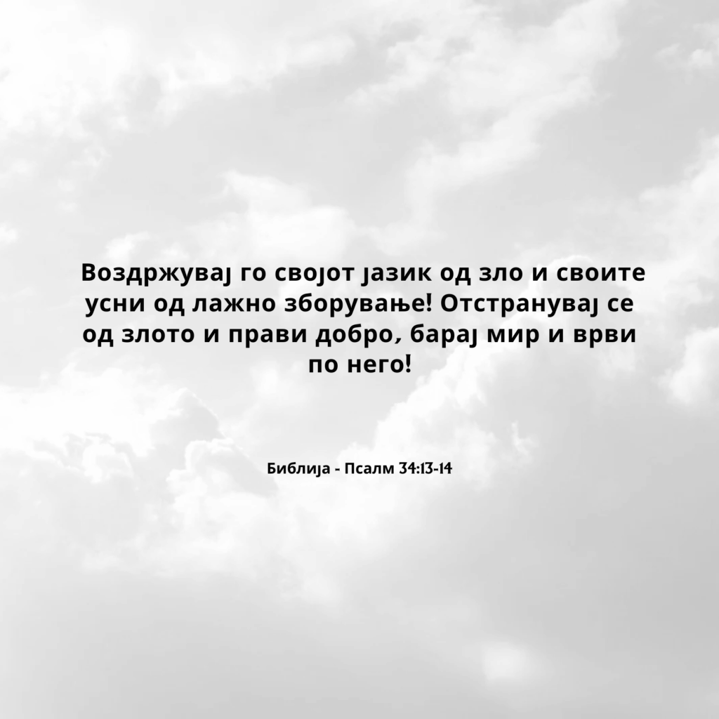 Воздржувај го својот јазик од зло и своите усни од лажно зборување! Отстранувај се од злото и прави добро, барај мир и врви по него!