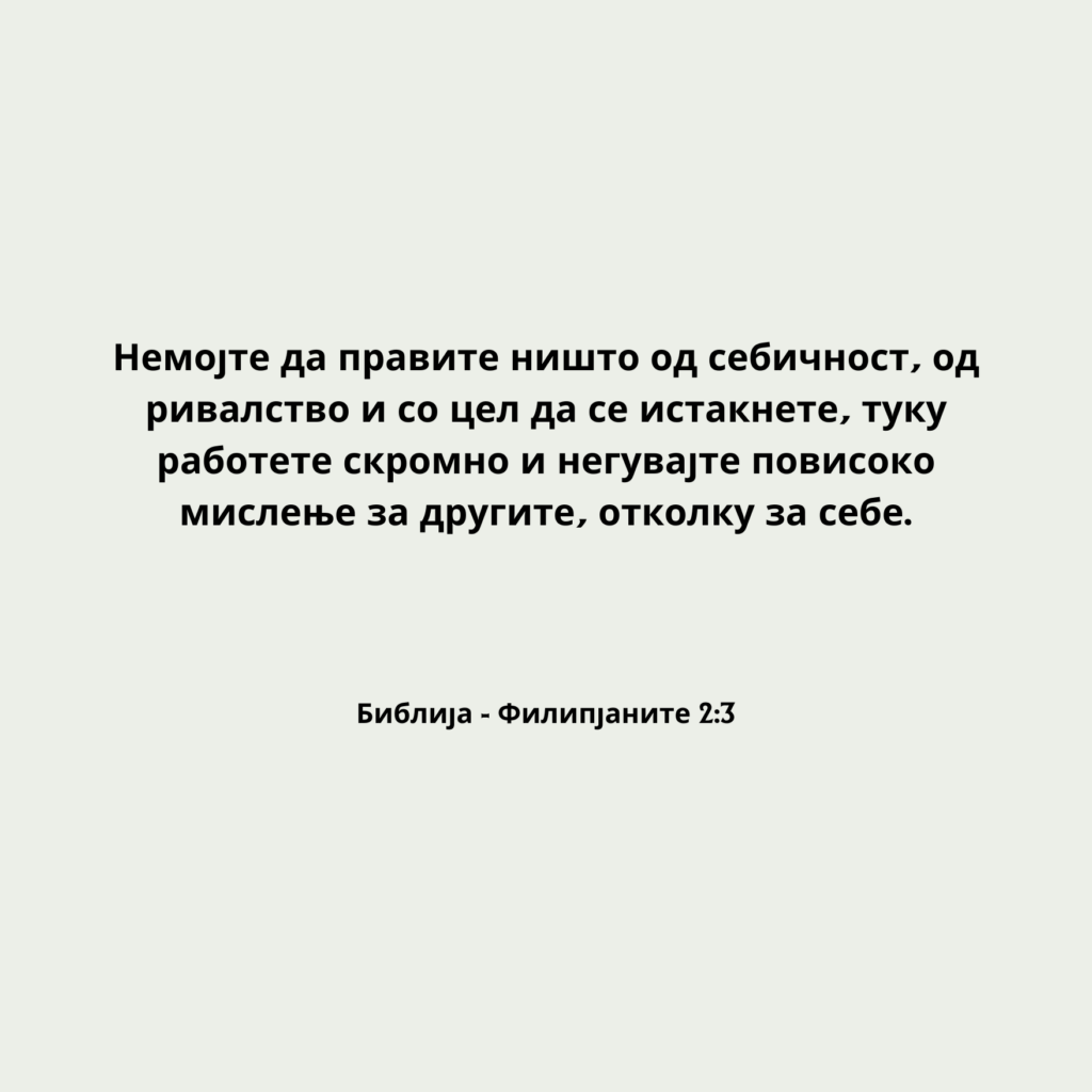 Немојте да правите ништо од себичност, од ривалство и со цел да се истакнете, туку работете скромно и негувајте повисоко мислење за другите, отколку за себе.