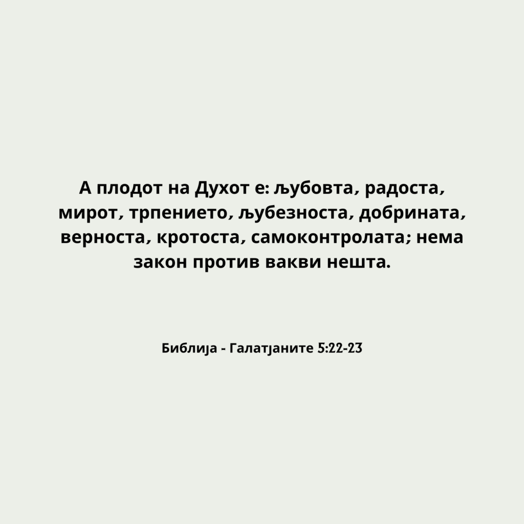 А плодот на Духот е: љубовта, радоста, мирот, трпението, љубезноста, добрината, верноста, кротоста, самоконтролата; нема закон против вакви нешта.