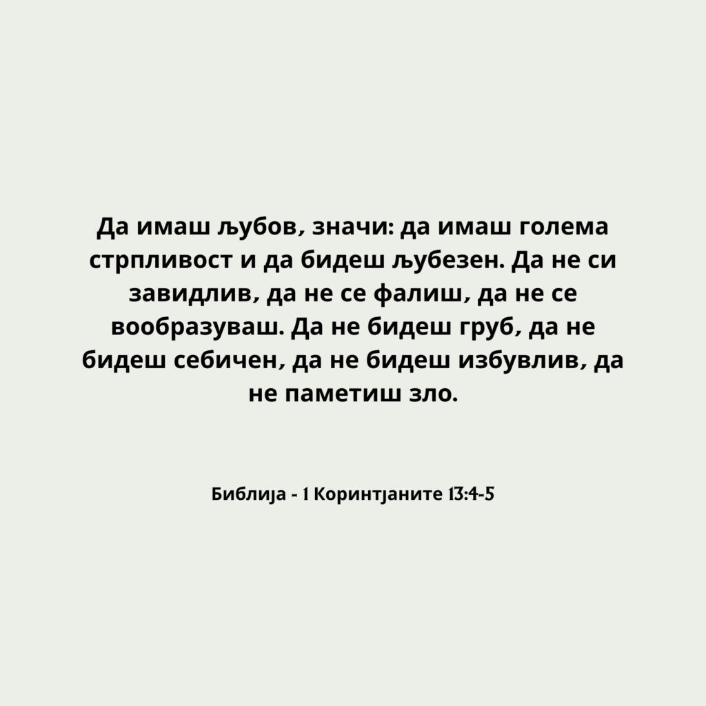 Да имаш љубов, значи: да имаш голема стрпливост и да бидеш љубезен. Да не си завидлив, да не се фалиш, да не се вообразуваш. Да не бидеш груб, да не бидеш себичен, да не бидеш избувлив, да не паметиш зло.