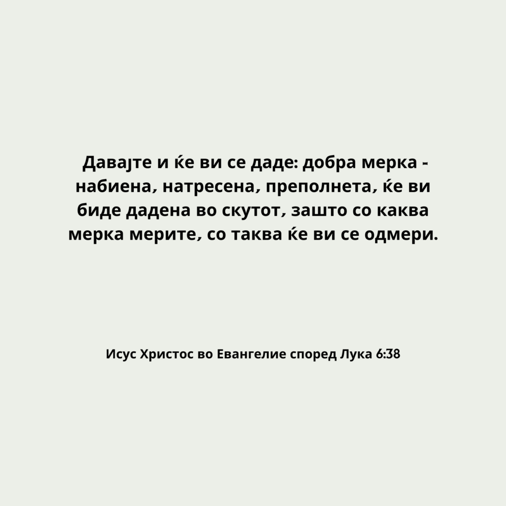 Давајте и ќе ви се даде: добра мерка – набиена, натресена, преполнета, ќе ви биде дадена во скутот, зашто со каква мерка мерите, со таква ќе ви се одмери.