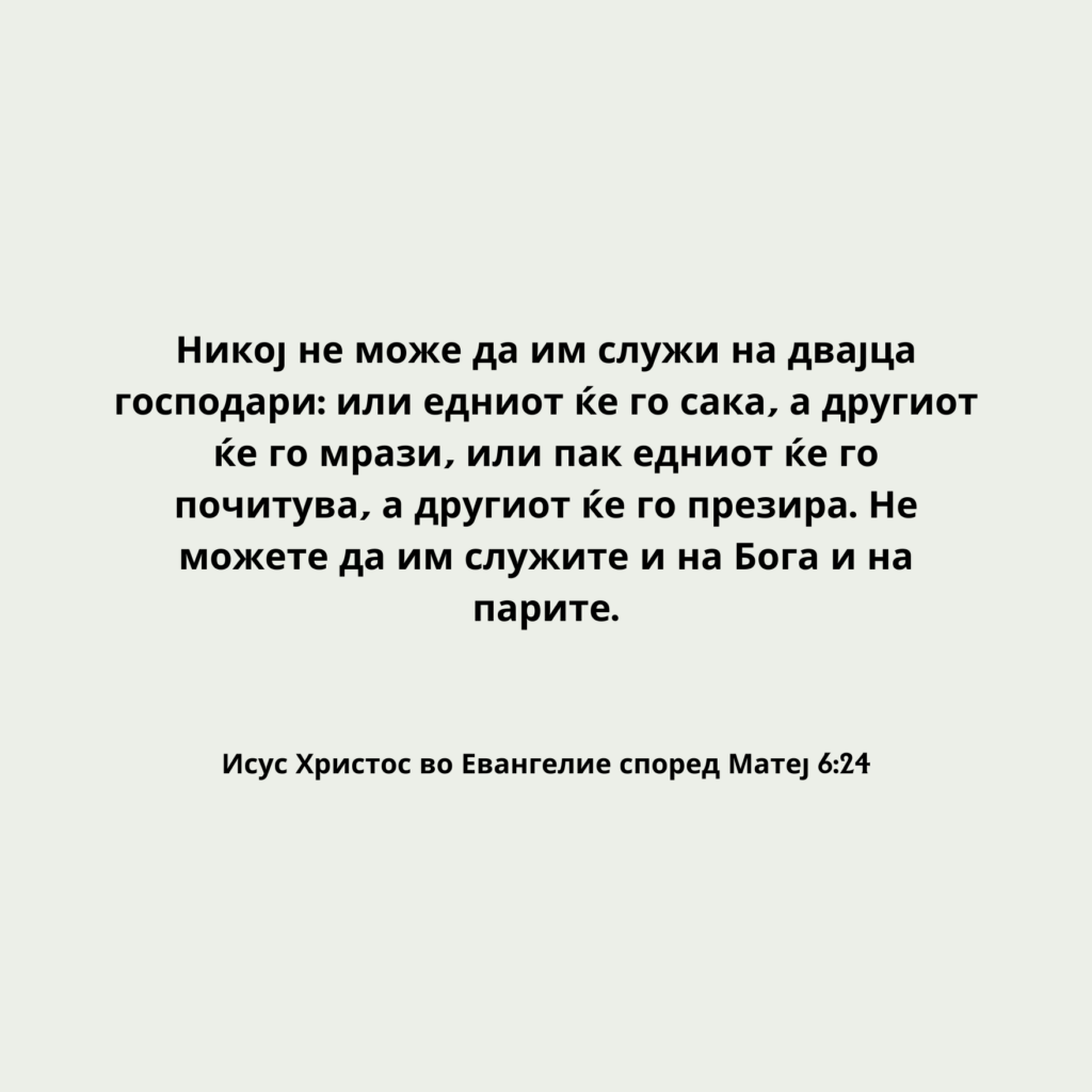 Никој не може да им служи на двајца господари: или едниот ќе го сака, а другиот ќе го мрази, или пак едниот ќе го почитува, а другиот ќе го презира. Не можете да им служите и на Бога и на парите.