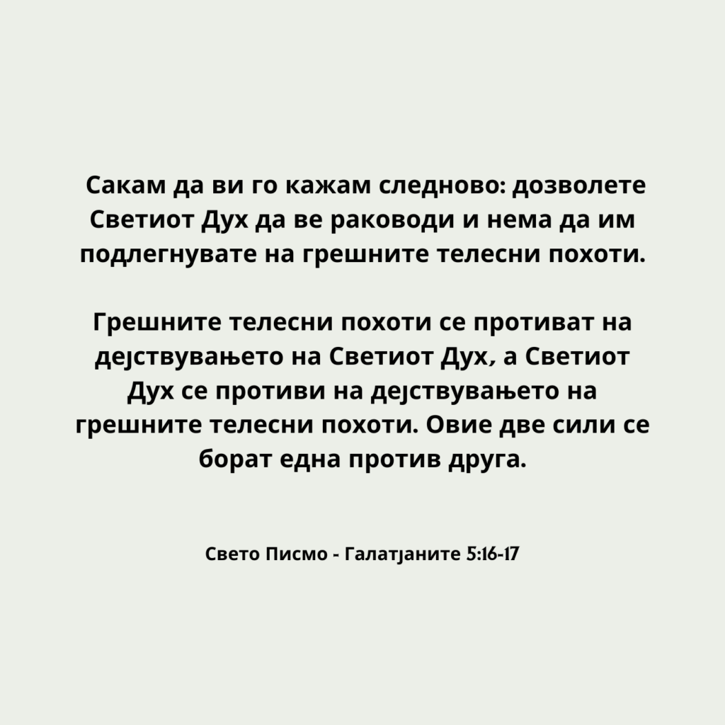 Сакам да ви го кажам следново: дозволете Светиот Дух да ве раководи и нема да им подлегнувате на грешните телесни похоти.