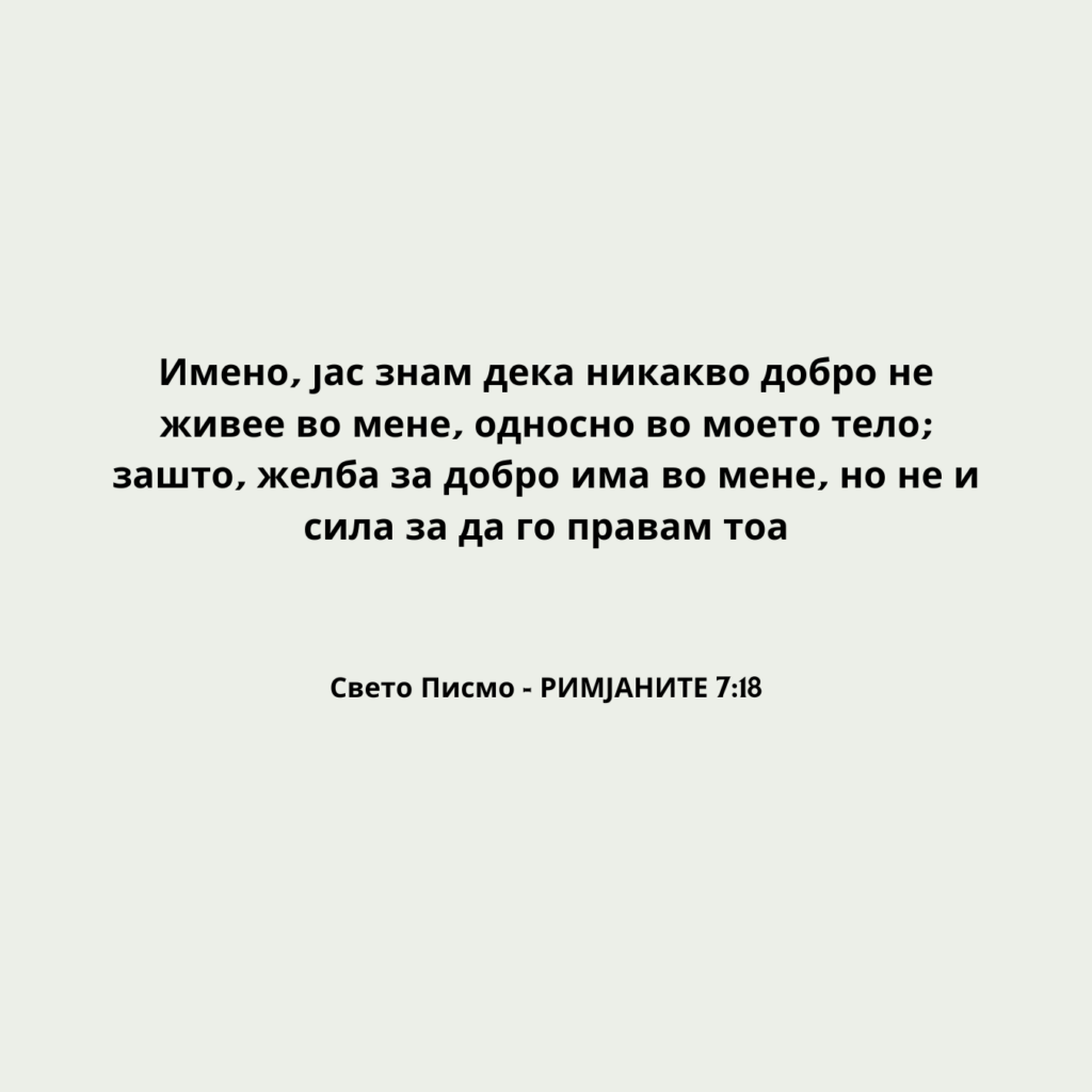Имено, јас знам дека никакво добро не живее во мене, односно во моето тело; зашто, желба за добро има во мене, но не и сила за да го правам тоа