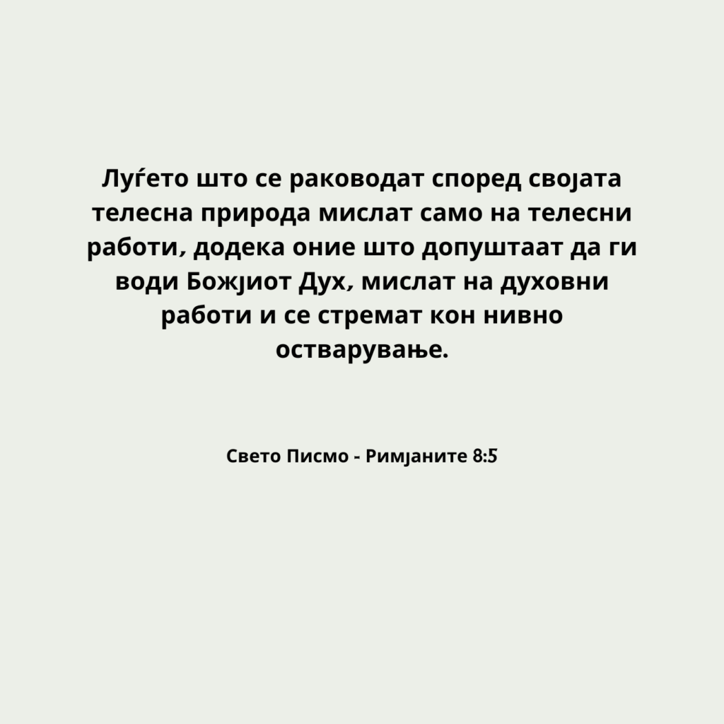 Луѓето што се раководат според својата телесна природа мислат само на телесни работи, додека оние што допуштаат да ги води Божјиот Дух, мислат на духовни работи и се стремат кон нивно остварување.