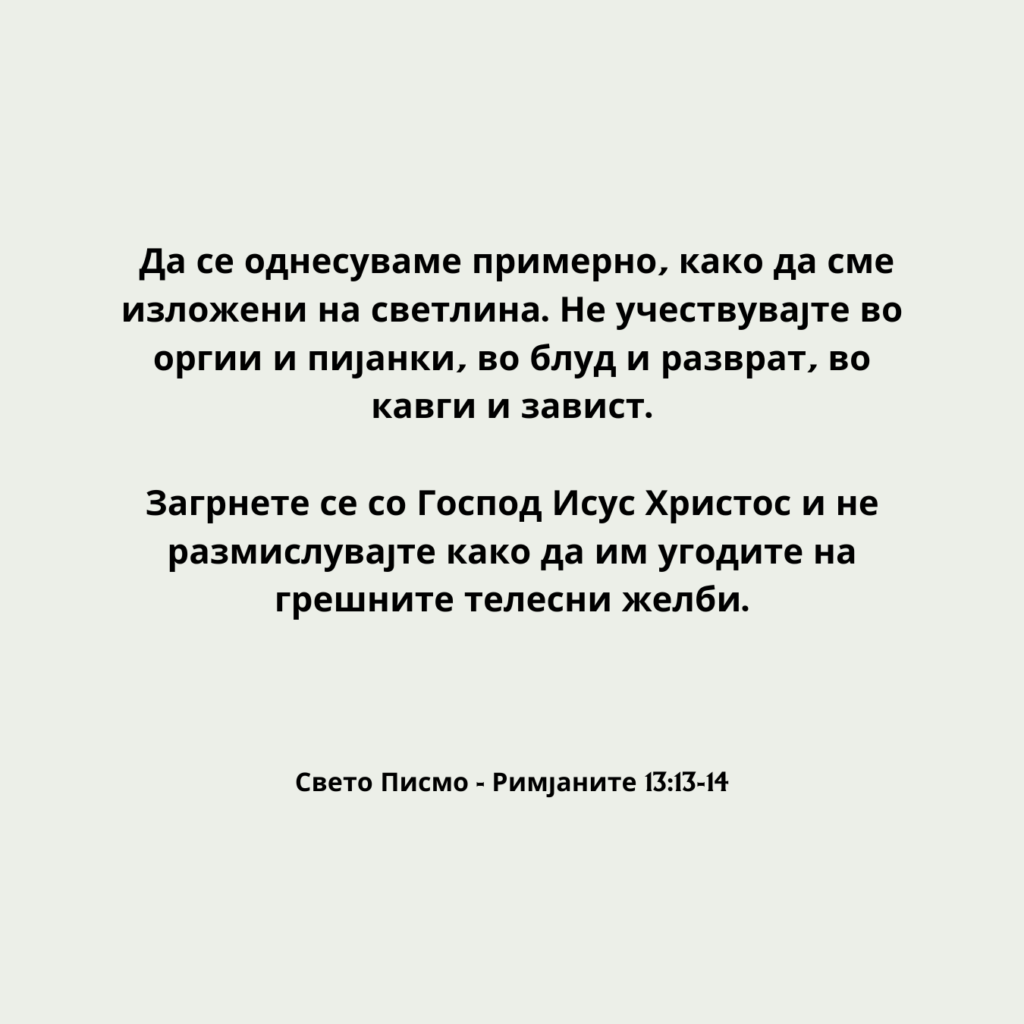 Да се однесуваме примерно, како да сме изложени на светлина. Не учествувајте во оргии и пијанки, во блуд и разврат, во кавги и завист.