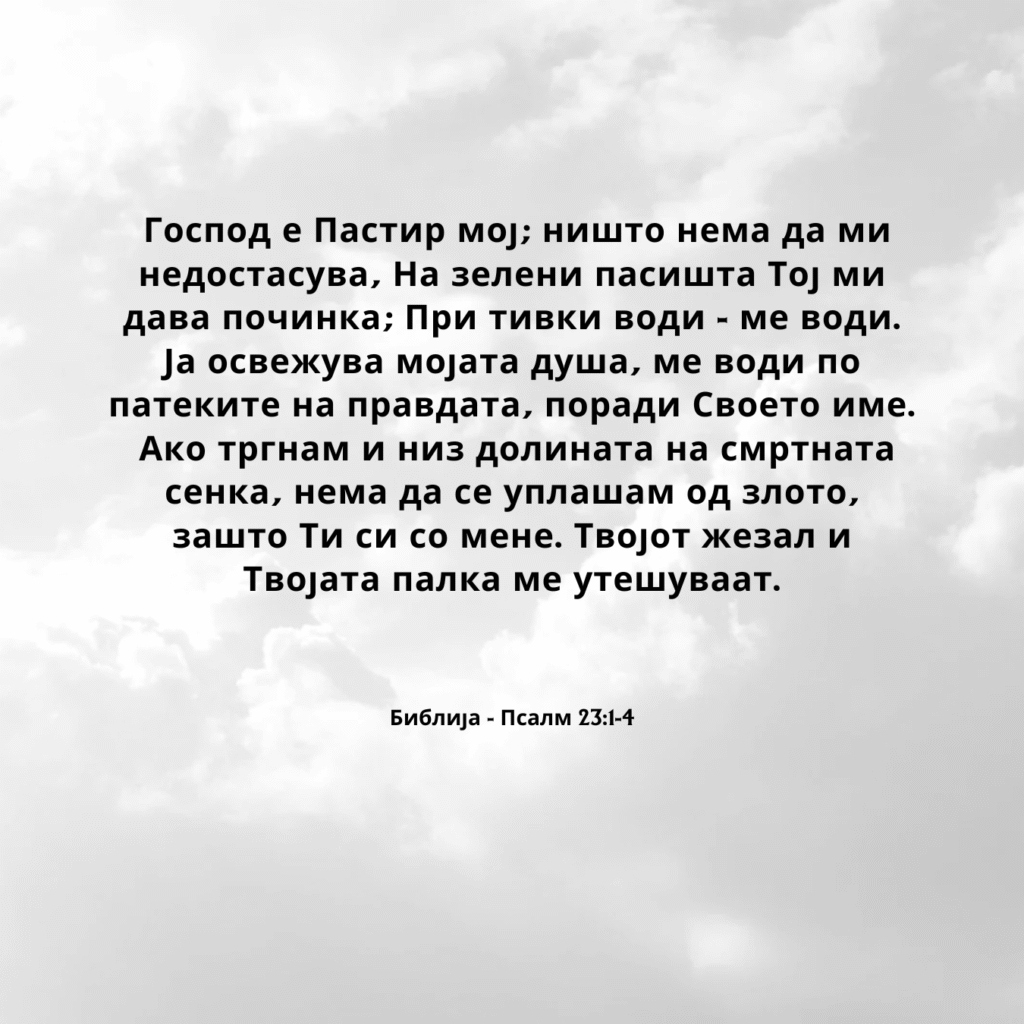 Господ е Пастир мој; ништо нема да ми недостасува, На зелени пасишта Тој ми дава починка; При тивки води – ме води. Ја освежува мојата душа, ме води по патеките на правдата, поради Своето име.