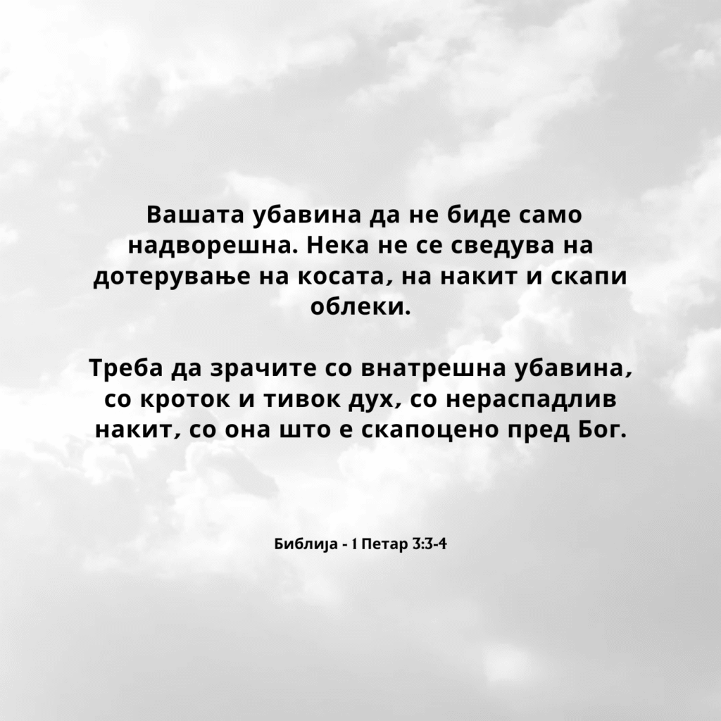 Треба да зрачите со внатрешна убавина, со кроток и тивок дух, со нераспадлив накит, со она што е скапоцено пред Бог.
