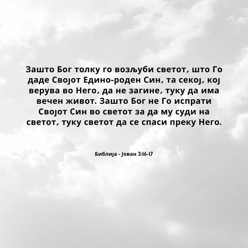 Зашто Бог толку го возљуби светот, што Го даде Својот Едино-роден Син, та секој, кој верува во Него, да не загине, туку да има вечен живот. Зашто Бог не Го испрати Својот Син во светот за да му суди на светот, туку светот да се спаси преку Него.