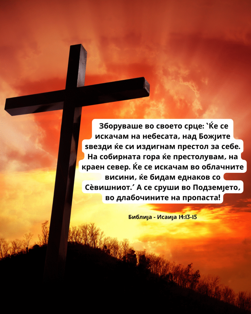 Зборуваше во своето срце: ‘Ќе се искачам на небесата, над Божјите ѕвезди ќе си издигнам престол за себе. На собирната гора ќе престолувам, на краен север. Ќе се искачам во облачните висини, ќе бидам еднаков со Сѐвишниот.’ А се сруши во Подземјето, во длабочините на пропаста!