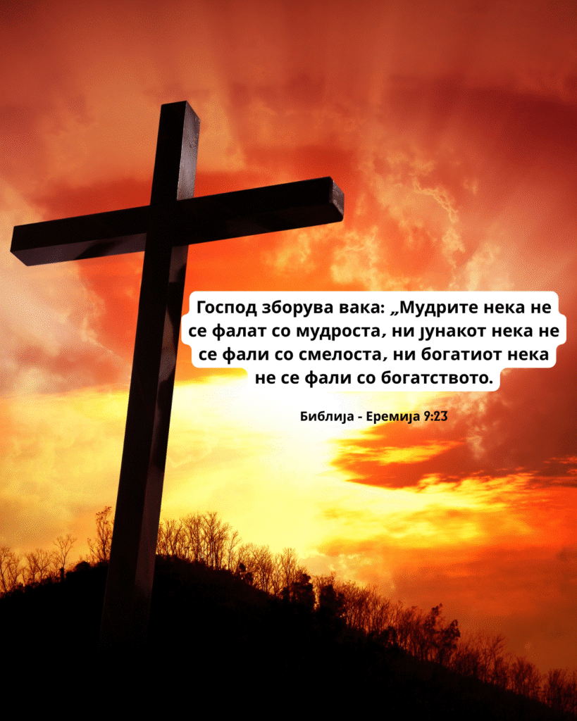 Господ зборува вака: „Мудрите нека не се фалат со мудроста, ни јунакот нека не се фали со смелоста, ни богатиот нека не се фали со богатството.