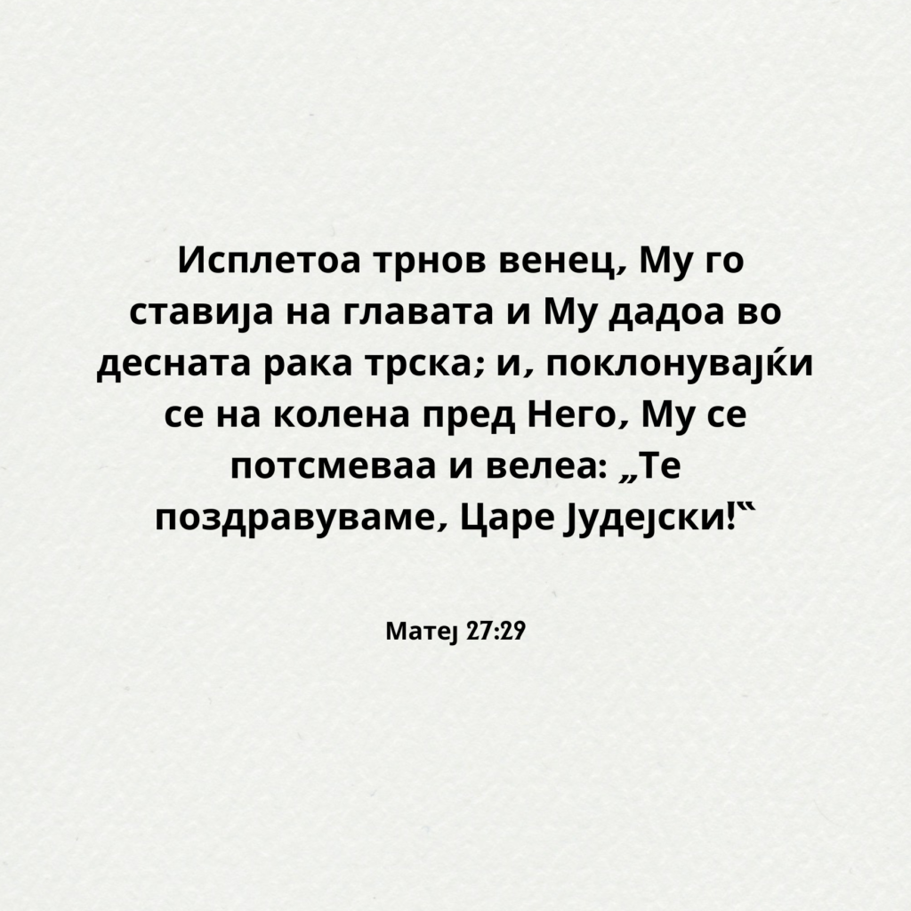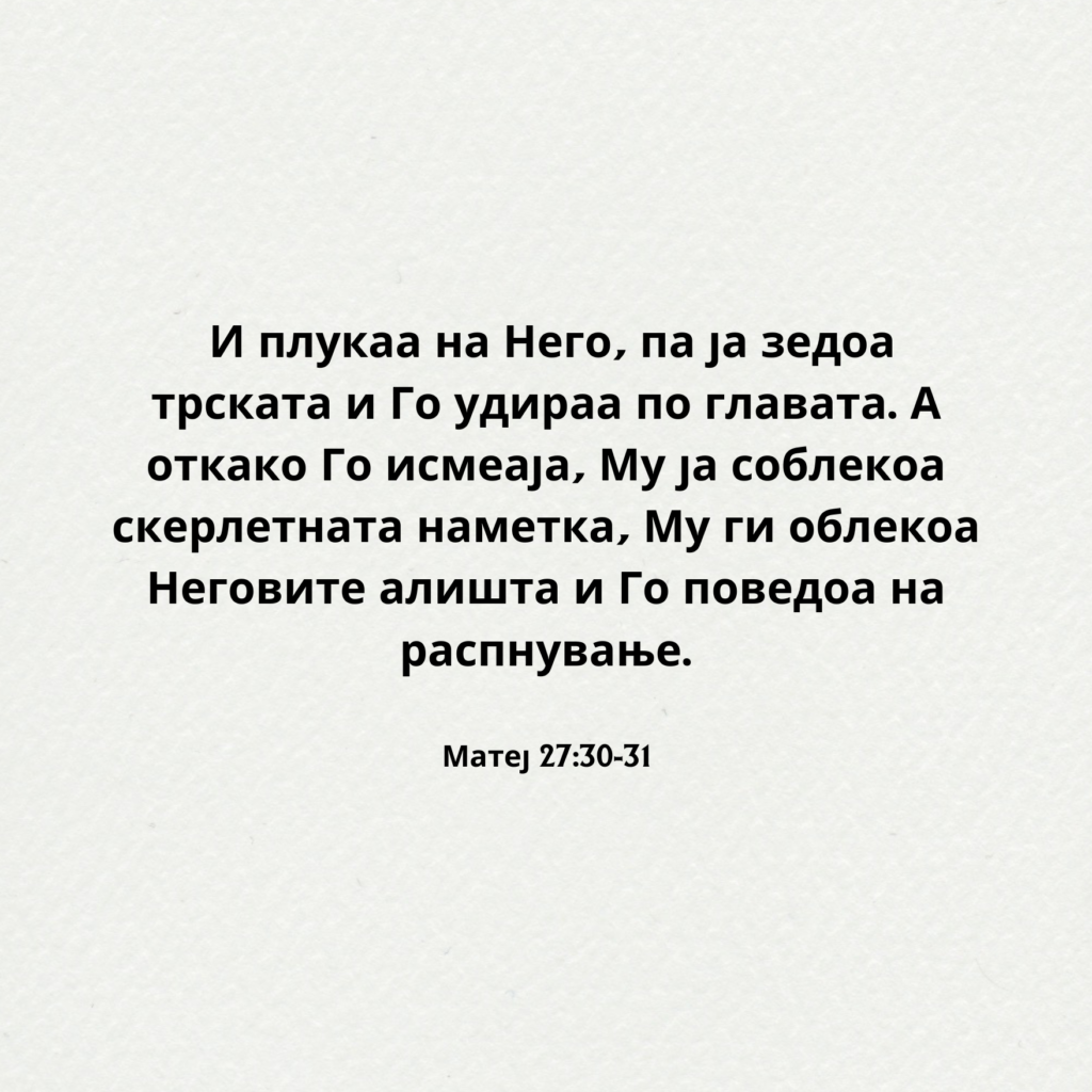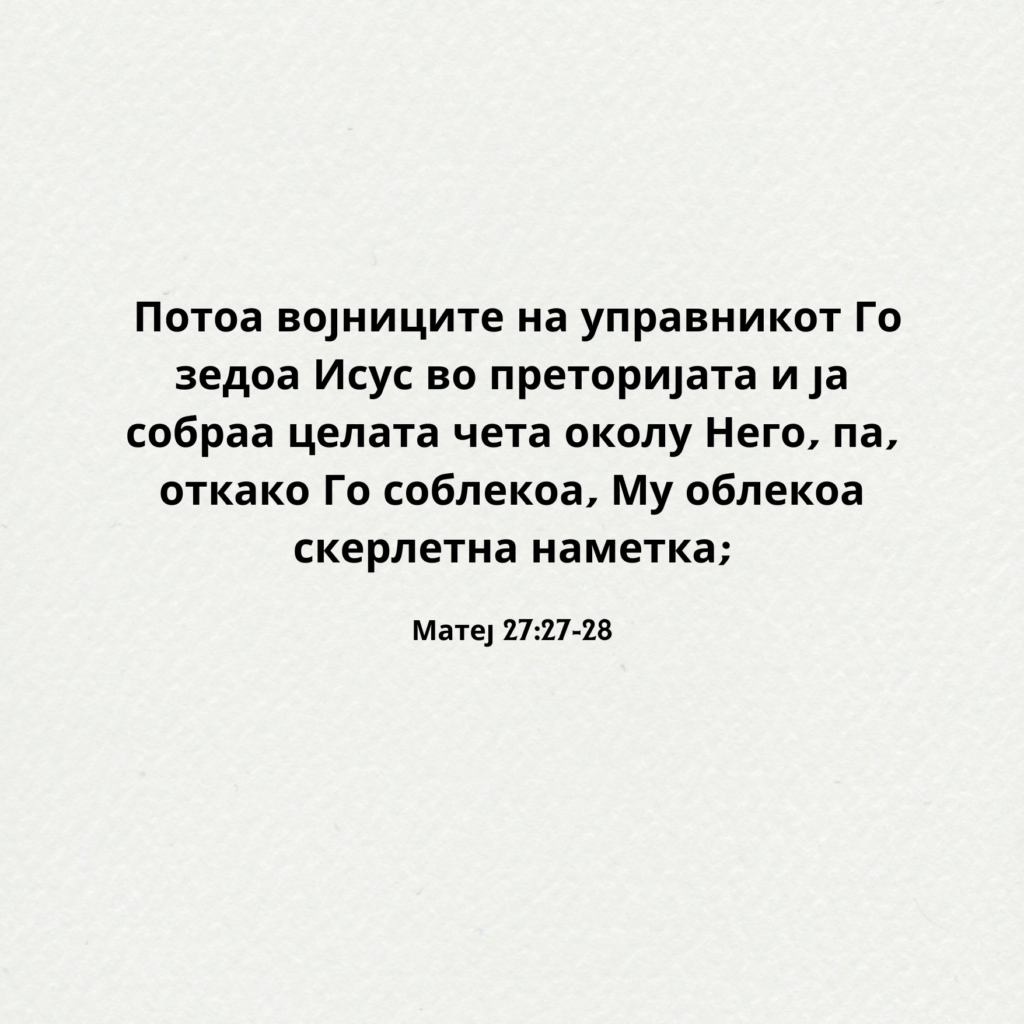 Потоа војниците на управникот Го зедоа Исус во преторијата и ја собраа целата чета околу Него, 28па, откако Го соблекоа, Му облекоа скерлетна наметка; 29исплетоа трнов венец, Му го ставија на главата и Му дадоа во десната рака трска; и, поклонувајќи се на колена пред Него, Му се потсмеваа и велеа: „Те поздравуваме, Царе Јудејски!“ 30И плукаа на Него, па ја зедоа трската и Го удираа по главата. 31А откако Го исмеаја, Му ја соблекоа скерлетната наметка, Му ги облекоа Неговите алишта и Го поведоа на распнување. Матеј 27:27-31