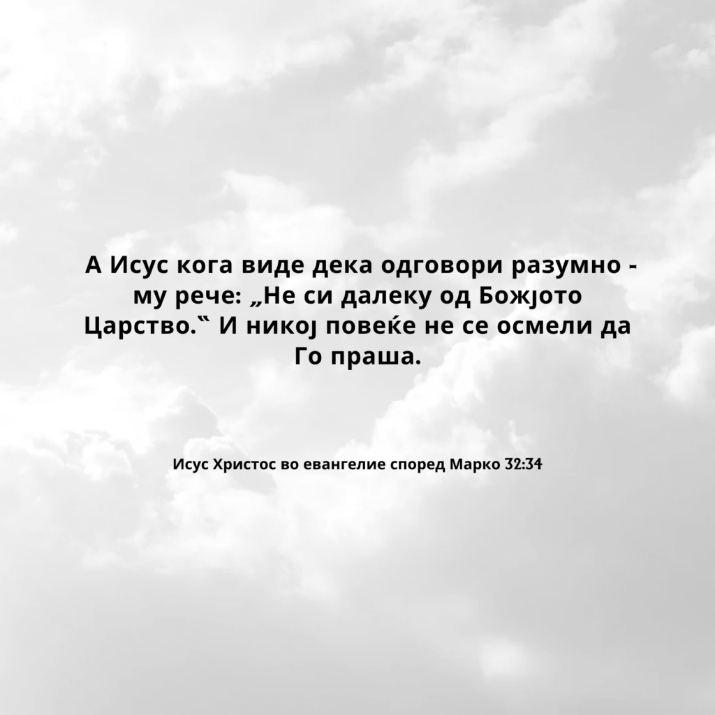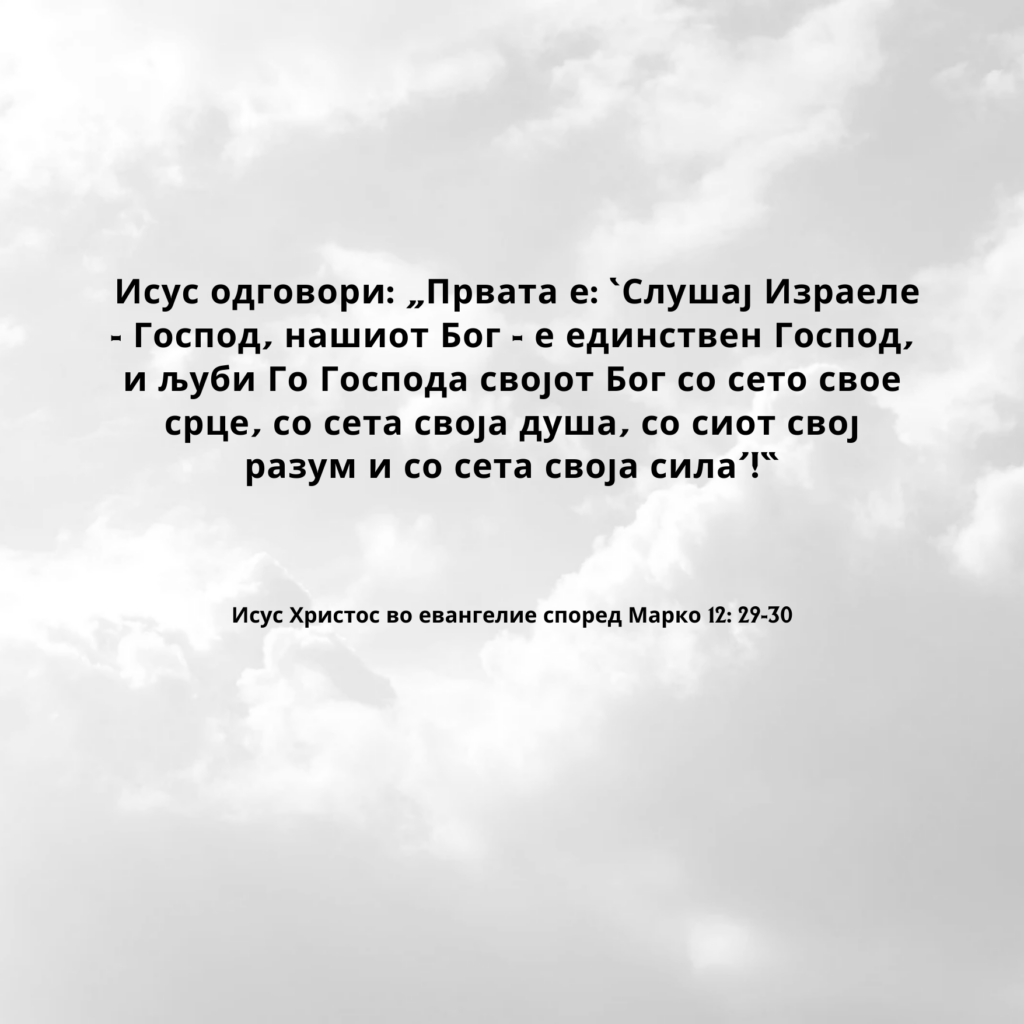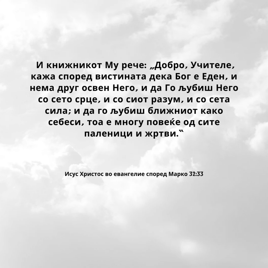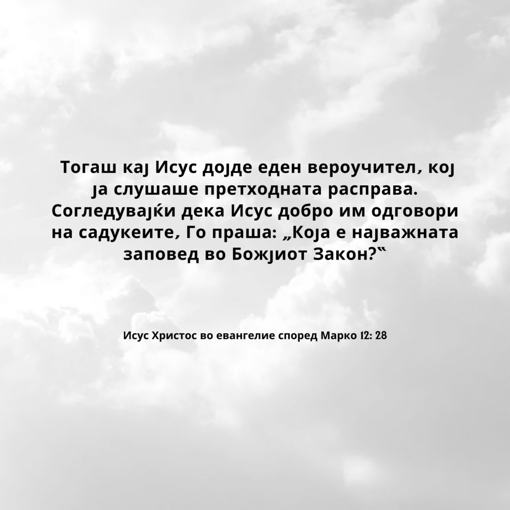 И пристапи еден од книжниците, кој чу како се препираат, знаејќи дека им одговори добро, Го праша: „Која е прва од сите заповеди?“Исус одговори: „Првата е: ‘Слушај Израеле – Господ, нашиот Бог – е единствен Господ, и љуби Го Господа својот Бог со сето свое срце, со сета своја душа, со сиот свој разум и со сета своја сила’!“ А оваа е втората: „Љуби го својот ближен како себеси!“ Друга заповед, поголема од овие, нема.“ И книжникот Му рече: „Добро, Учителе, кажа според вистината дека Бог е Еден, и нема друг освен Него, и да Го љубиш Него со сето срце, и со сиот разум, и со сета сила; и да го љубиш ближниот како себеси, тоа е многу повеќе од сите паленици и жртви.“ А Исус кога виде дека одговори разумно – му рече: „Не си далеку од Божјото Царство.“ И никој повеќе не се осмели да Го праша.