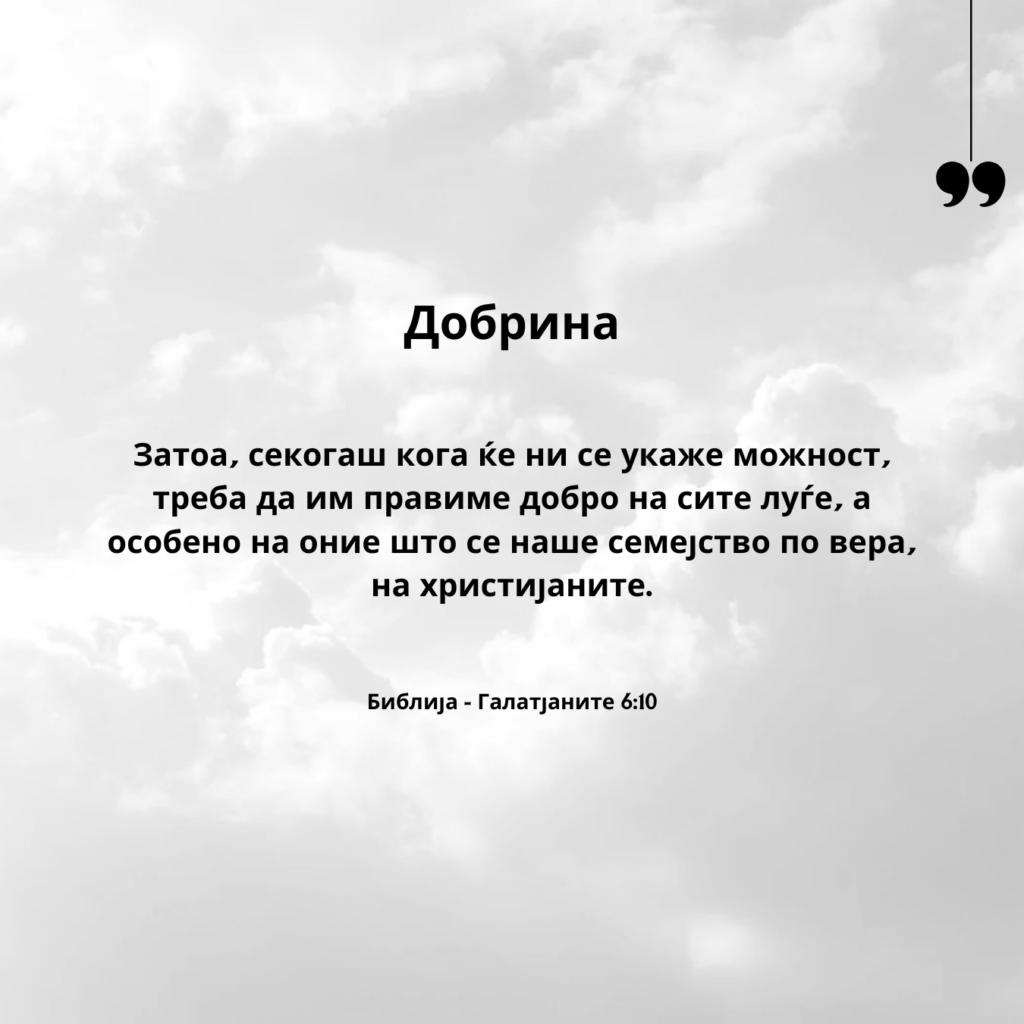 Затоа, секогаш кога ќе ни се укаже можност, треба да им правиме добро на сите луѓе, а особено на оние што се наше семејство по вера, на христијаните.