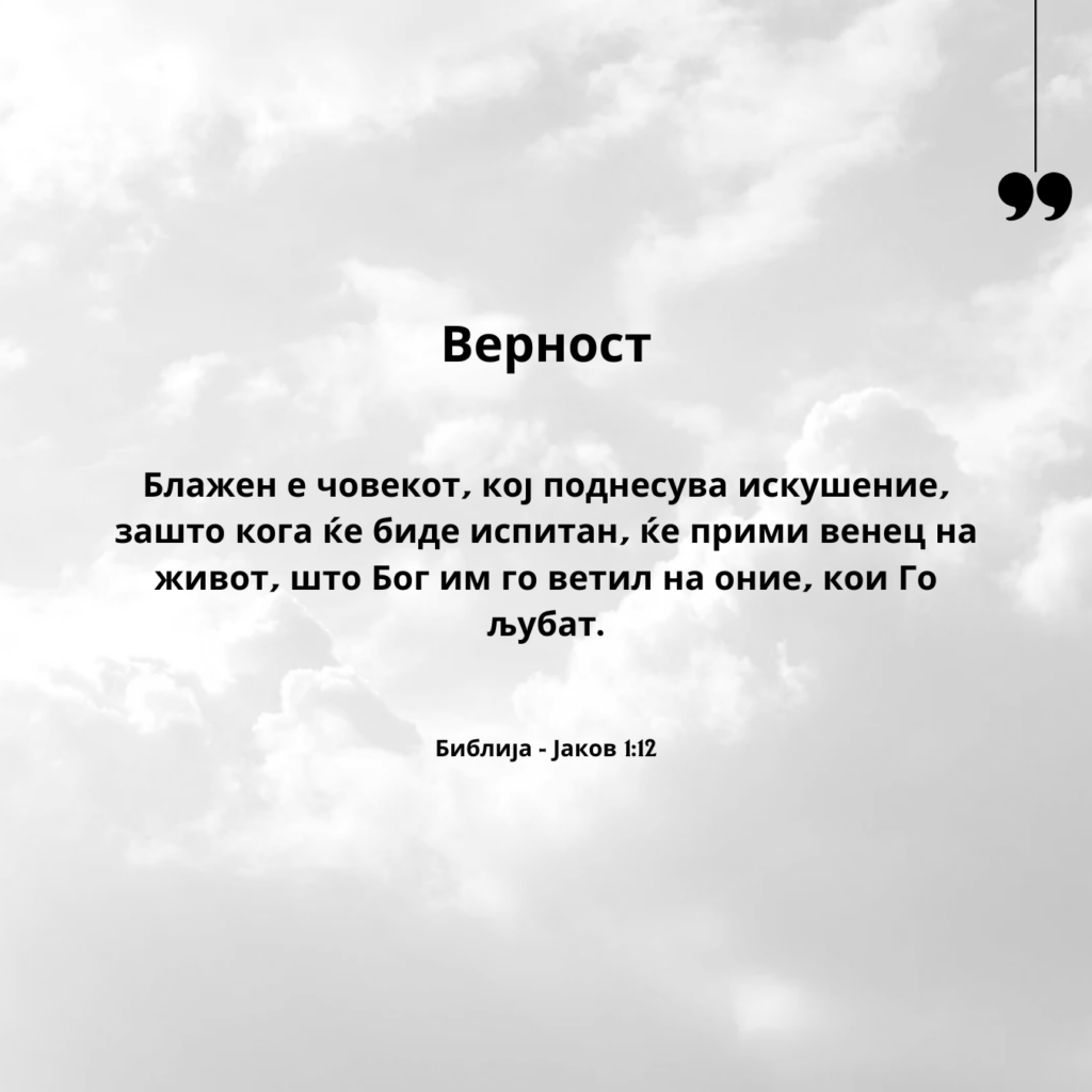 Блажен е човекот, кој поднесува искушение, зашто кога ќе биде испитан, ќе прими венец на живот, што Бог им го ветил на оние, кои Го љубат.