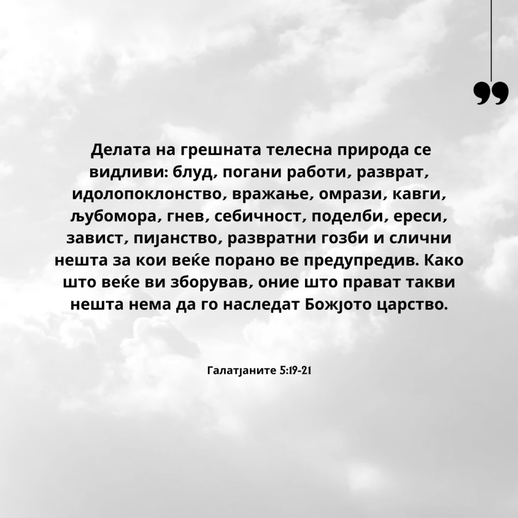 Делата на грешната телесна природа се видливи: блуд, погани работи, разврат, идолопоклонство, вражање, омрази, кавги, љубомора, гнев, себичност, поделби, ереси, завист, пијанство, развратни гозби и слични нешта за кои веќе порано ве предупредив. Како што веќе ви зборував, оние што прават такви нешта нема да го наследат Божјото царство.
