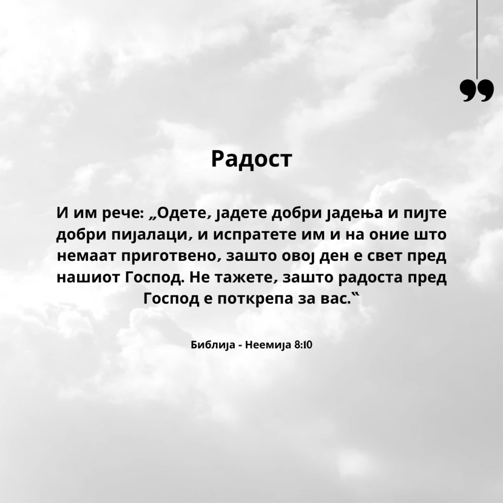 И им рече: „Одете, јадете добри јадења и пијте добри пијалаци, и испратете им и на оние што немаат приготвено, зашто овој ден е свет пред нашиот Господ. Не тажете, зашто радоста пред Господ е поткрепа за вас.“