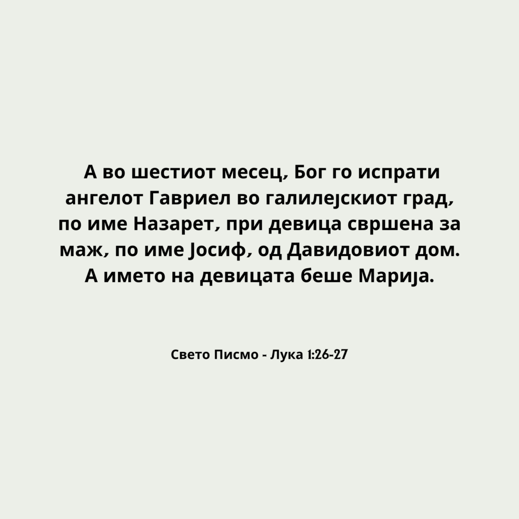 И кога ангелот дојде при неа ѝ рече: „Радувај се благодатна! Гос-под е со тебе, благословена си ти меѓу жените!“ Таа се уплаши од тој збор и размислуваше: каков поздрав ќе биде тоа? Тогаш ангелот ѝ рече: „Не бој се Марија, зашто си нашла милост пред Бога. И ете, ќе зачнеш и ќе родиш Син, и ќе Му го дадеш името Исус.