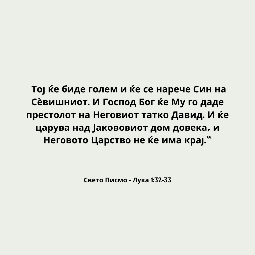 Тој ќе биде голем и ќе се нарече Син на Сѐвишниот. И Господ Бог ќе Му го даде престолот на Неговиот татко Давид. И ќе царува над Јакововиот дом довека, и Неговото Царство не ќе има крај.“