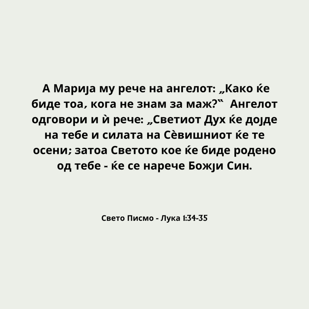 А Марија му рече на ангелот: „Како ќе биде тоа, кога не знам за маж?“ Ангелот одговори и ѝ рече: „Светиот Дух ќе дојде на тебе и силата на Сѐвишниот ќе те осени; затоа Светото кое ќе биде родено од тебе – ќе се нарече Божји Син.