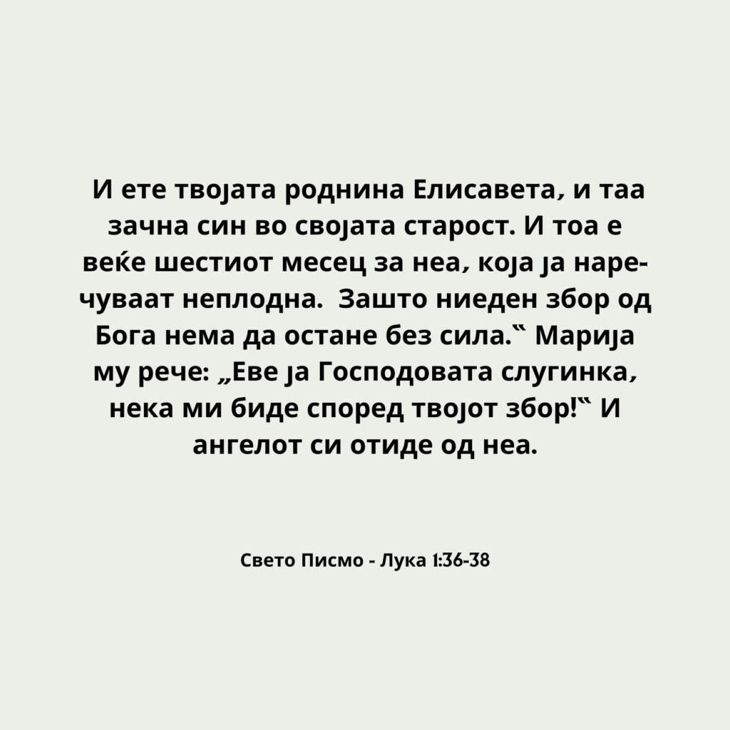 И ете твојата роднина Елисавета, и таа зачна син во својата старост. И тоа е веќе шестиот месец за неа, која ја наре-чуваат неплодна. Зашто ниеден збор од Бога нема да остане без сила.“ Марија му рече: „Еве ја Господовата слугинка, нека ми биде според твојот збор!“ И ангелот си отиде од неа.