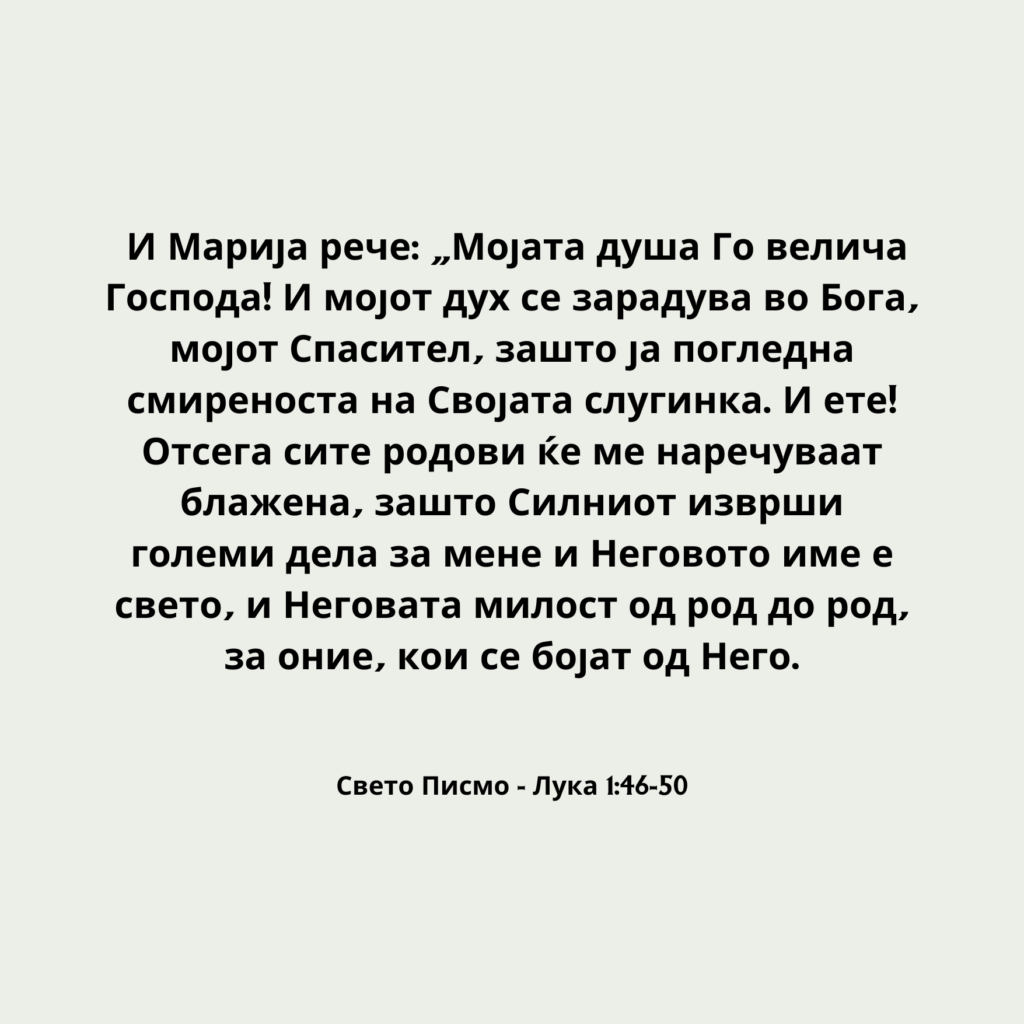 И Марија рече: „Мојата душа Го велича Господа! И мојот дух се зарадува во Бога, мојот Спасител, зашто ја погледна смиреноста на Својата слугинка. И ете! Отсега сите родови ќе ме наречуваат блажена, зашто Силниот изврши големи дела за мене и Неговото име е свето, и Неговата милост од род до род, за оние, кои се бојат од Него.