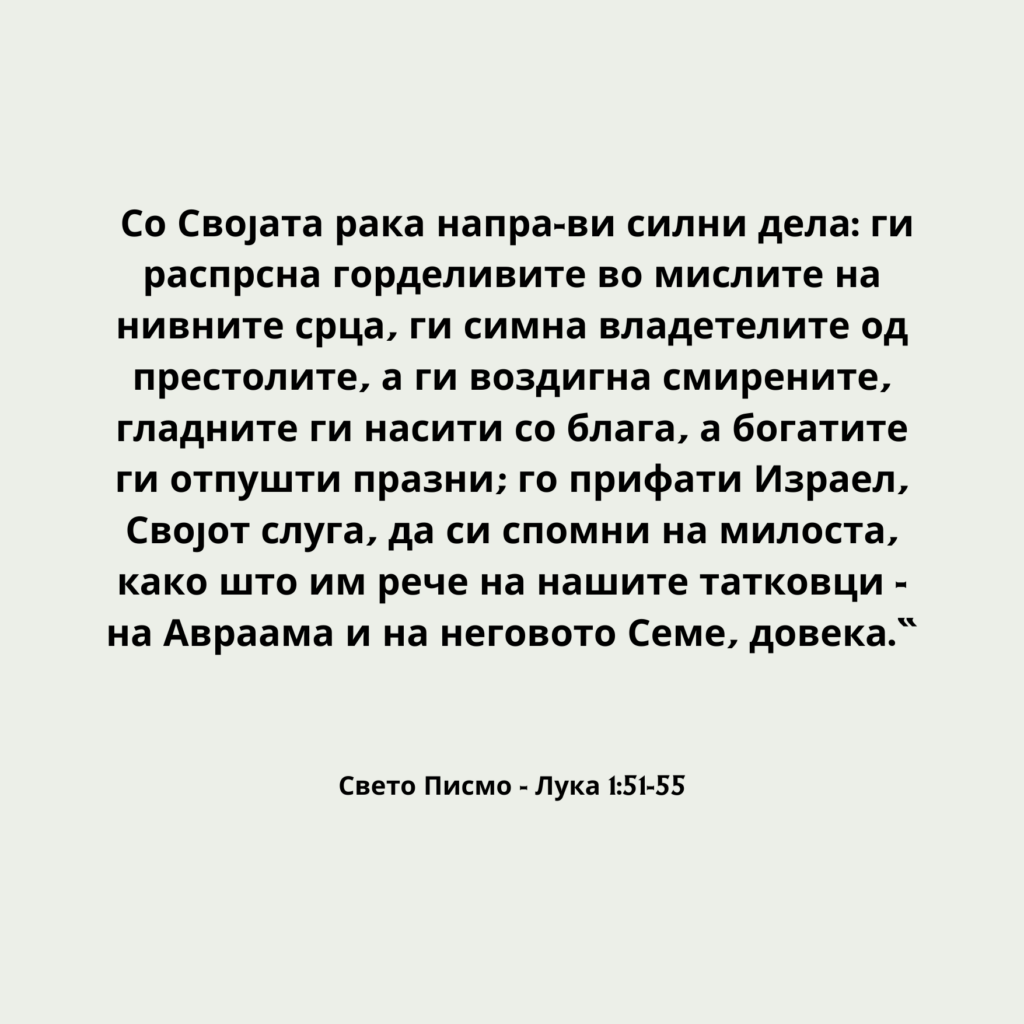 Со Својата рака напра-ви силни дела: ги распрсна горделивите во мислите на нивните срца, ги симна владетелите од престолите, а ги воздигна смирените, гладните ги насити со блага, а богатите ги отпушти празни; го прифати Израел, Својот слуга, да си спомни на милоста, како што им рече на нашите татковци – на Авраама и на неговото Семе, довека.“