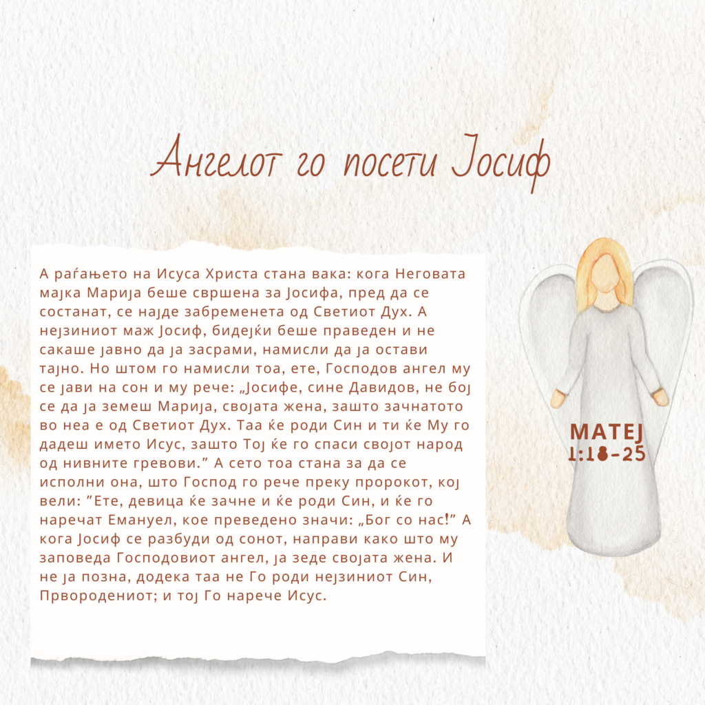 10Ангелот пак им рече: „Не бојте се, зашто, еве, ви најавувам добра вест, голема радост, која ќе биде за сите народи: