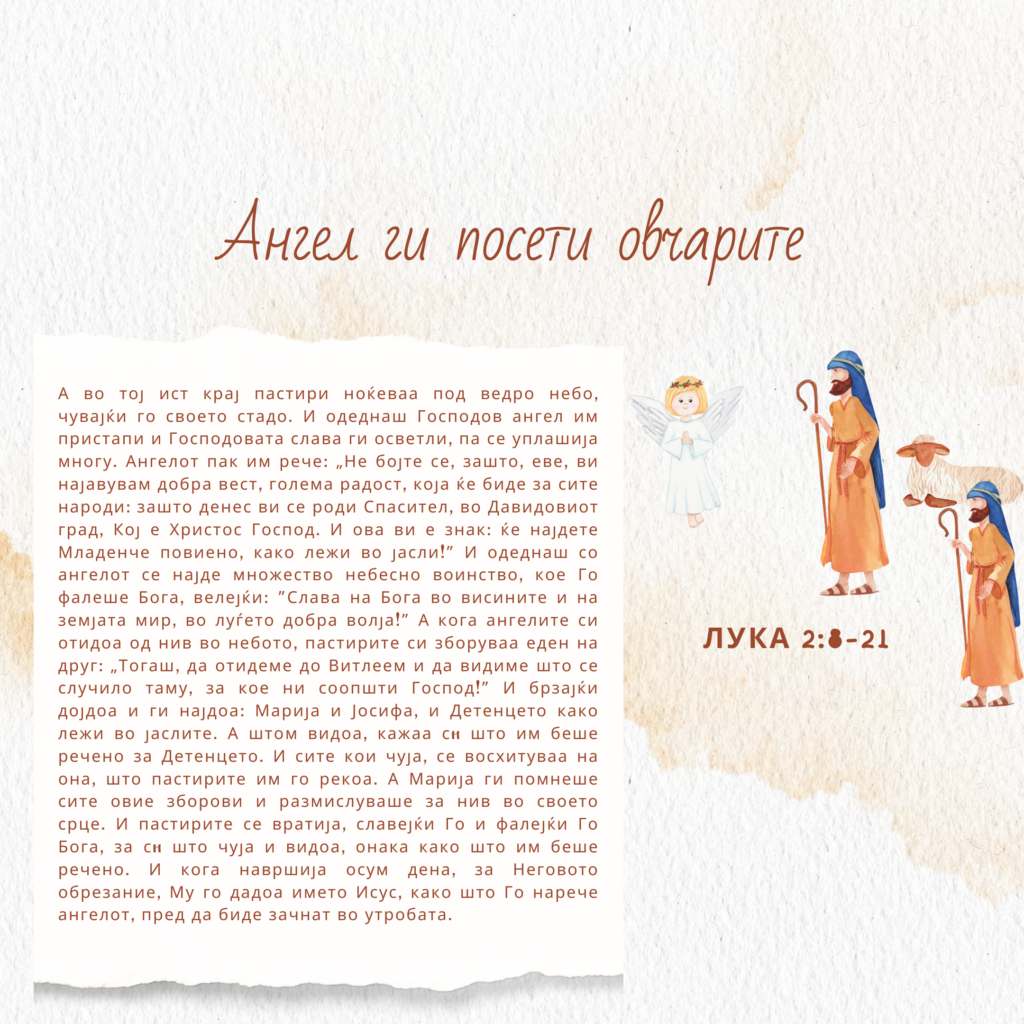 15А кога ангелите си отидоа од нив во небото, пастирите си зборуваа еден на друг: „Тогаш, да отидеме до Витлеем и да видиме што се случило таму, за кое ни соопшти Господ!”