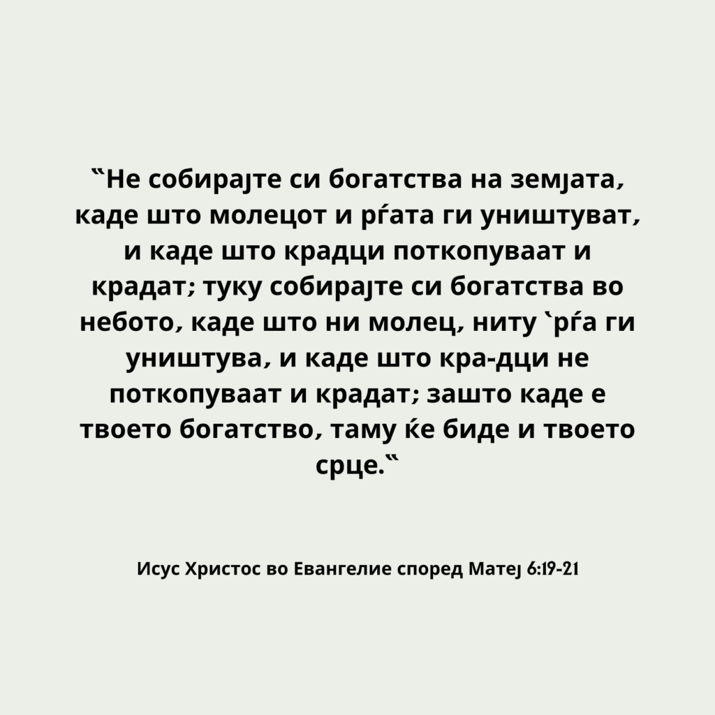 “Не собирајте си богатства на земјата, каде што молецот и рѓата ги уништуват, и каде што крадци поткопуваат и крадат; туку собирајте си богатства во небото, каде што ни молец, ниту ‘рѓа ги уништува, и каде што кра-дци не поткопуваат и крадат; зашто каде е твоето богатство, таму ќе биде и твоето срце.“