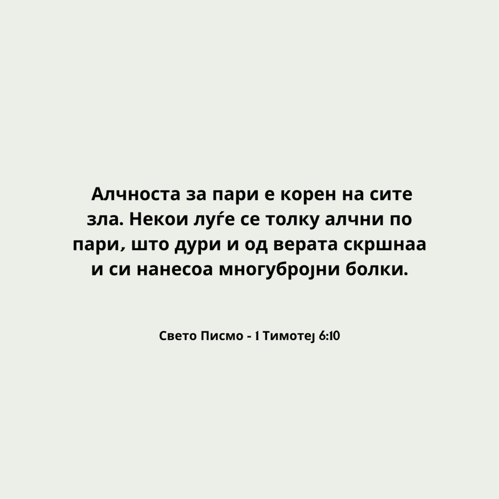 Алчноста за пари е корен на сите зла. Некои луѓе се толку алчни по пари, што дури и од верата скршнаа и си нанесоа многубројни болки.