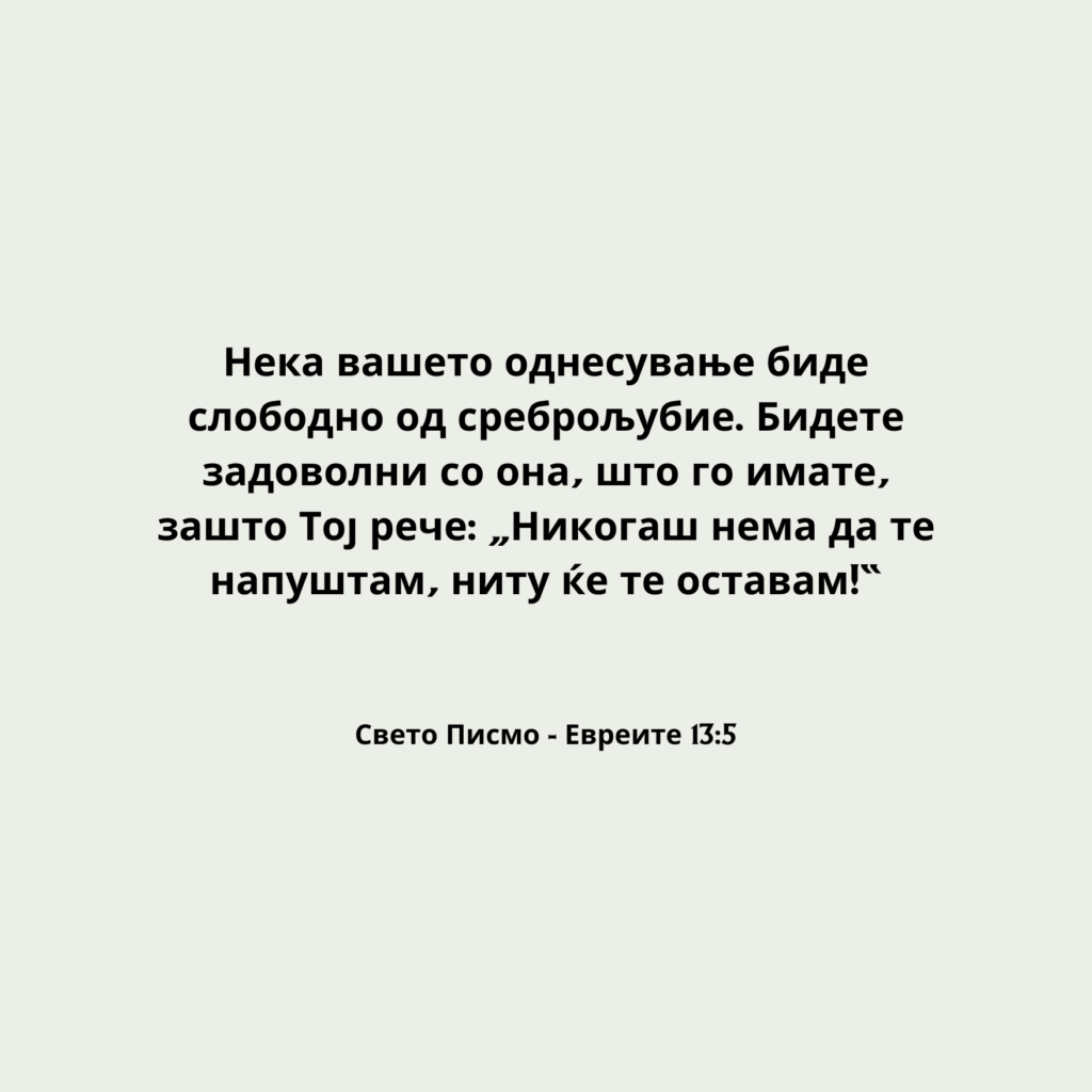 Нека вашето однесување биде слободно од среброљубие. Бидете задоволни со она, што го имате, зашто Тој рече: „Никогаш нема да те напуштам, ниту ќе те оставам!“