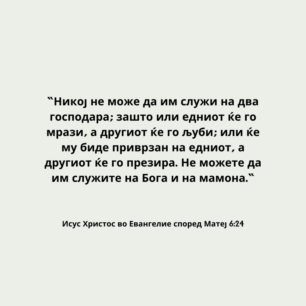 “Никој не може да им служи на два господара; зашто или едниот ќе го мрази, а другиот ќе го љуби; или ќе му биде приврзан на едниот, а другиот ќе го презира. Не можете да им служите на Бога и на мамона.“